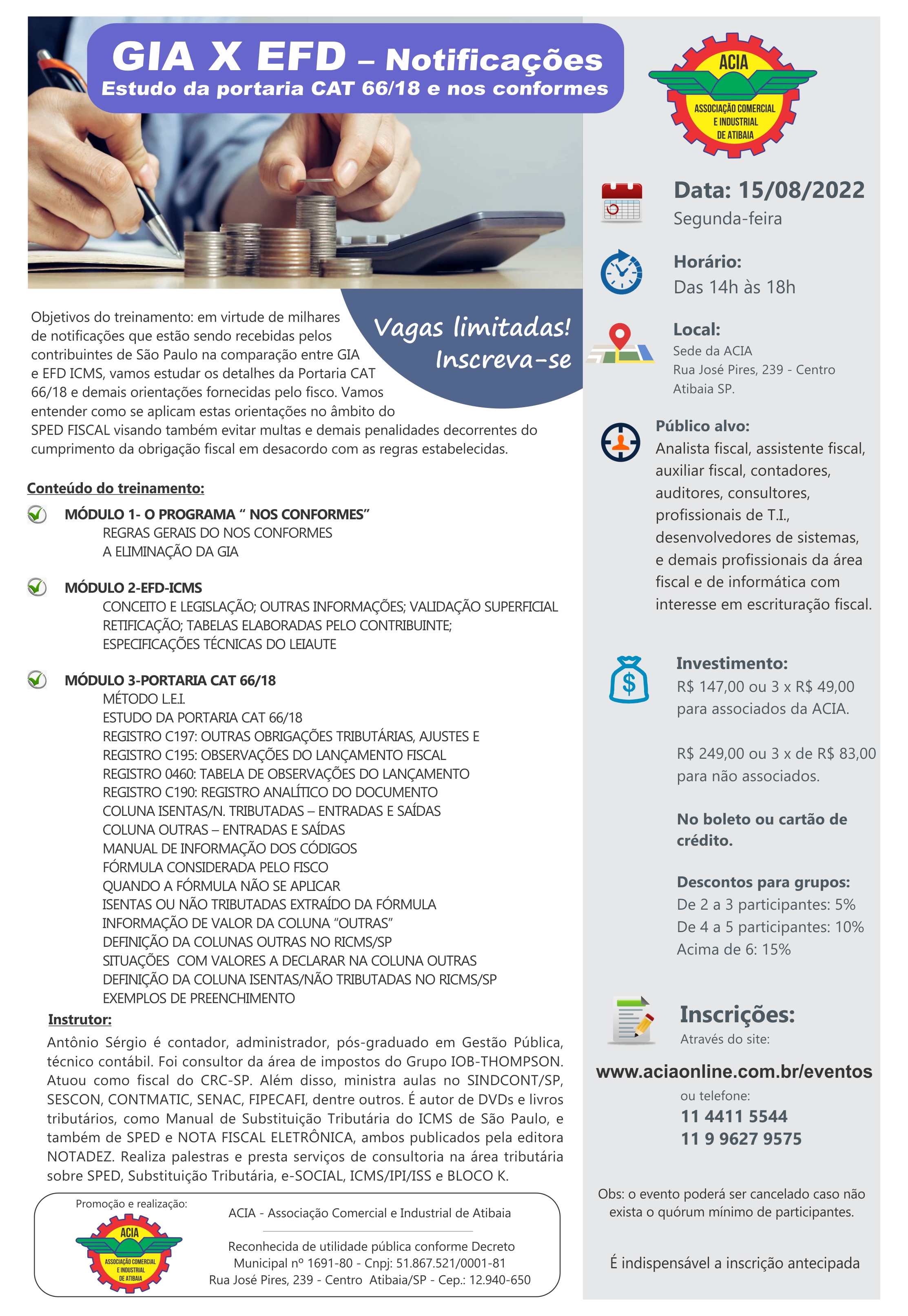 O treinamento acontecerá na próxima segunda-feira, dia 15 de agosto de 2022, das 14h às 18h, na sala 2 da ACIA, localizada em sua sede social na Rua José Pires, 239 - Centro - Atibaia/SP e será ministrado pelo renomado professor e escritor de diversos livros na área, Professor Antônio Sérgio de Oliveira. O público alvo, além dos contadores são: analista fiscal, assistente fiscal, auxiliar fiscal, auditores, consultores, profissionais de T.I.,  desenvolvedores de sistemas, e demais profissionais da área fiscal e de informática com  interesse em escrituração fiscal, entretanto, o evento está aberto a todos que desejam se aprofundar no assunto.